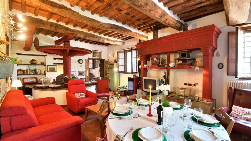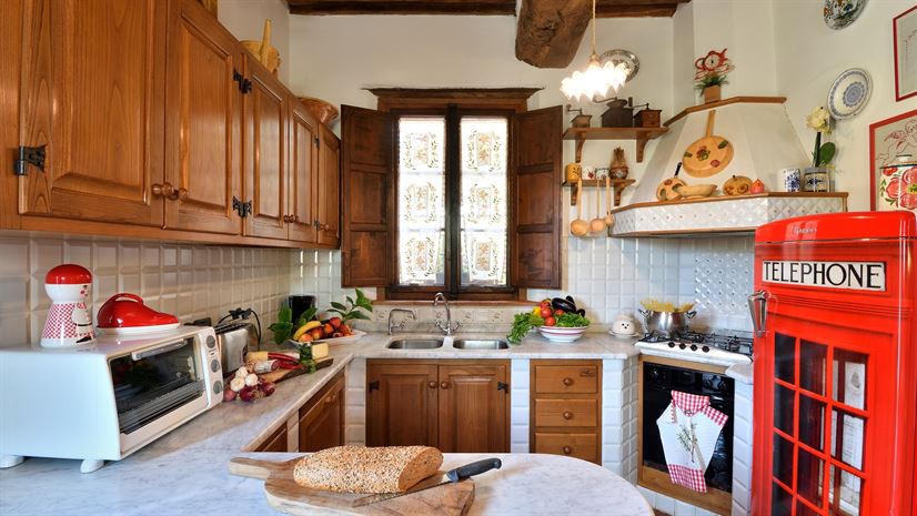 W pełni wyposażone, barek śniadaniowy, kuchenka gazowa, duża starożytna prasa do oliwek (dekoracja), sofa, fotel, piec na pelety, stół i krzesła.