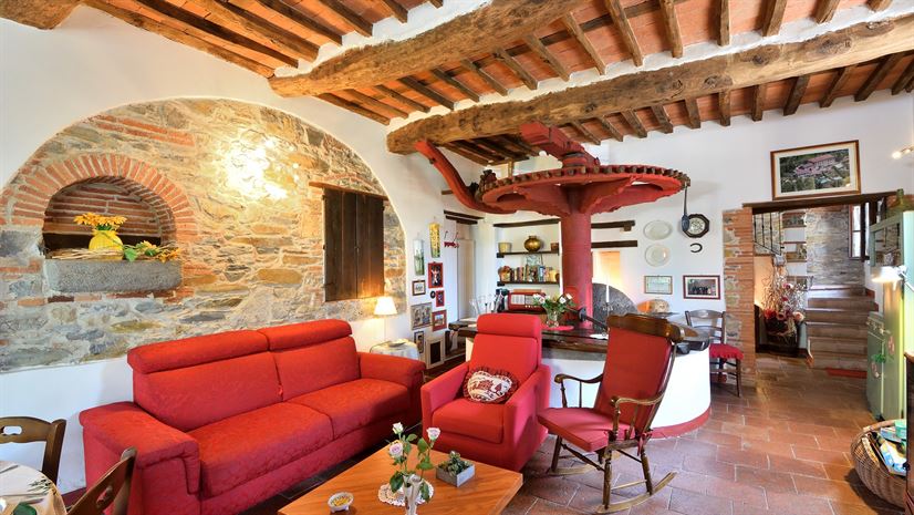 Wewnątrz znajdują się tradycyjne drewniane stropy, jasne ściany oraz fragmenty odsłoniętego kamienia, które podkreślają oryginalną strukturę budynku. Wnętrza są rustykalne i przytulne, z domową, ciepłą atmosferą. Szczególną atrakcją jest stara prasa do oliwek w salonie na parterze.