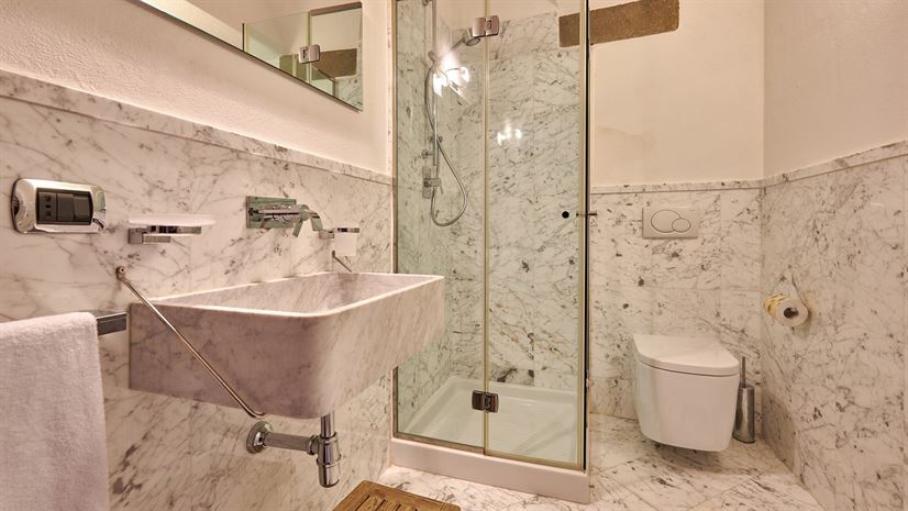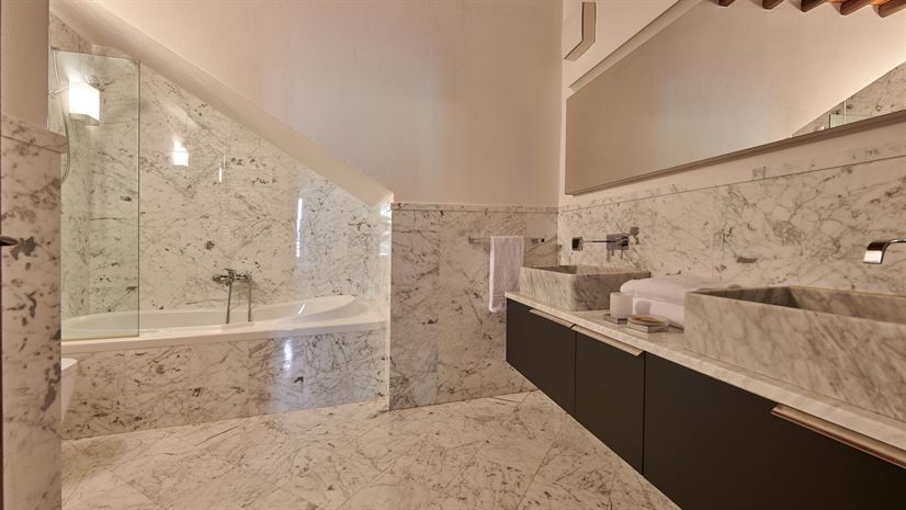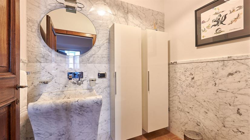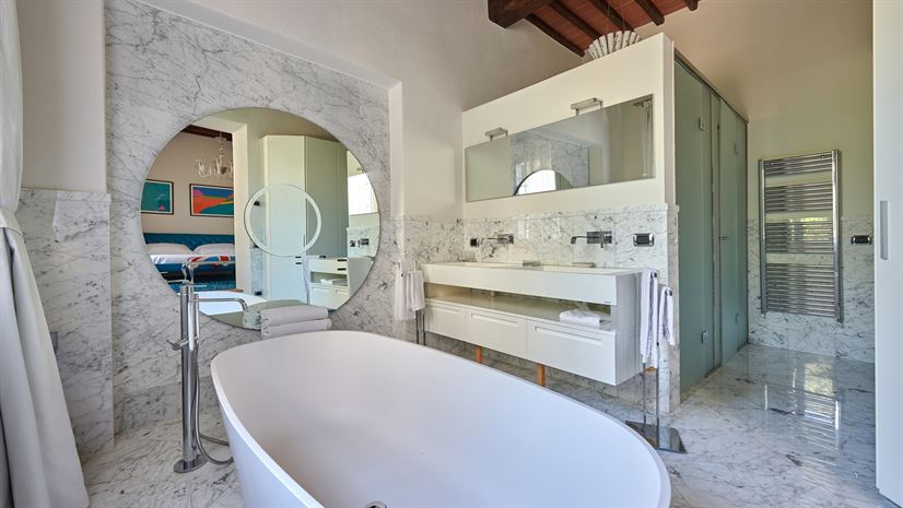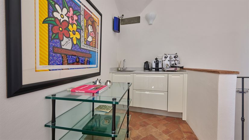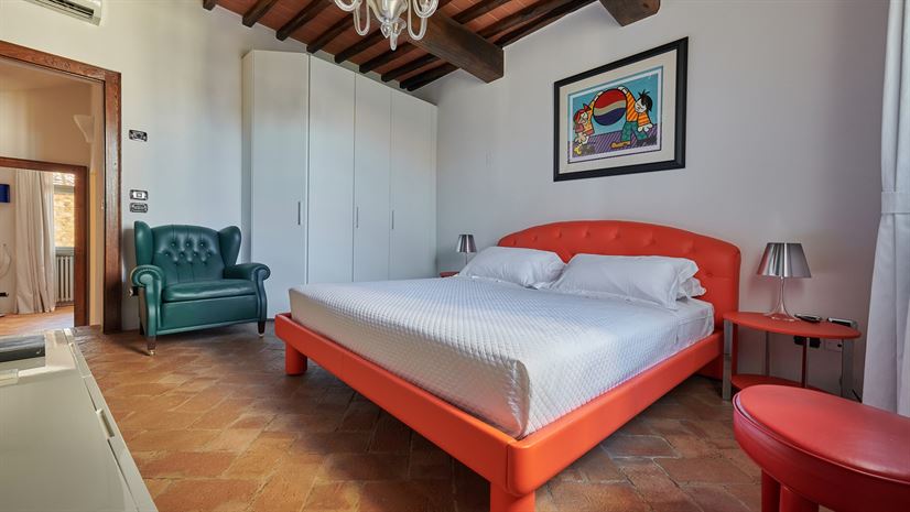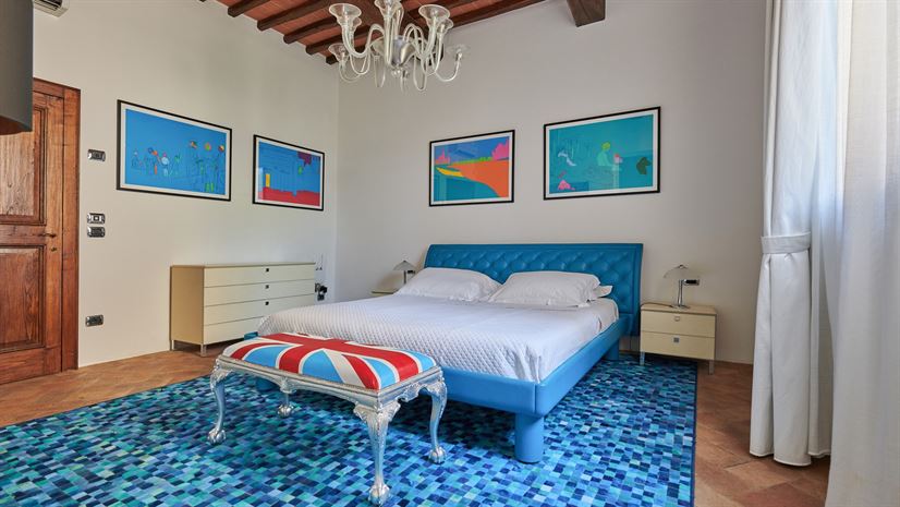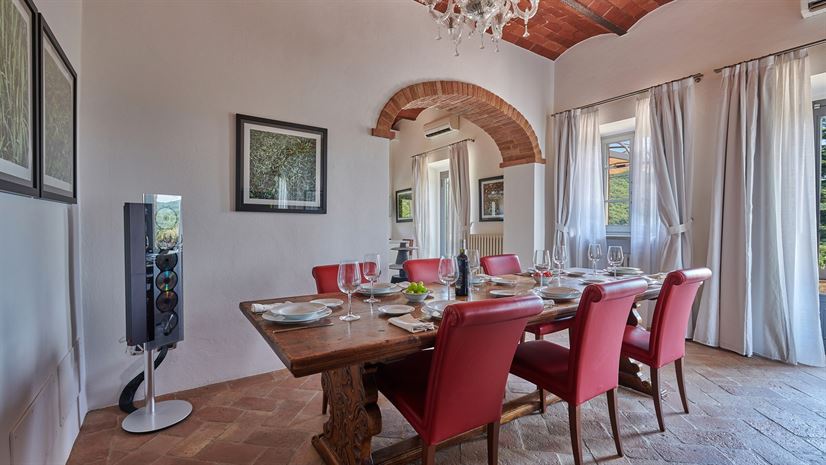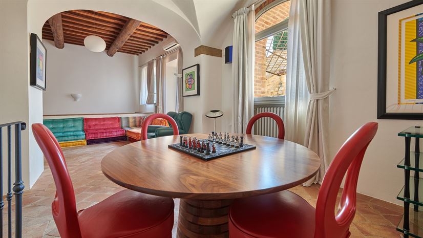 We wnętrzach zachowano oryginalne elementy, takie jak sklepione sufity, terakotowe podłogi i drewniane belkowane stropy. Tradycyjne detale doskonale kontrastują z eleganckim, nowoczesnym wystrojem autorstwa nagradzanego architekta wnętrz z Mediolanu. Wysokiej jakości meble i starannie dobrane akcenty kolorystyczne tworzą wyrafinowaną, a zarazem domową atmosferę.