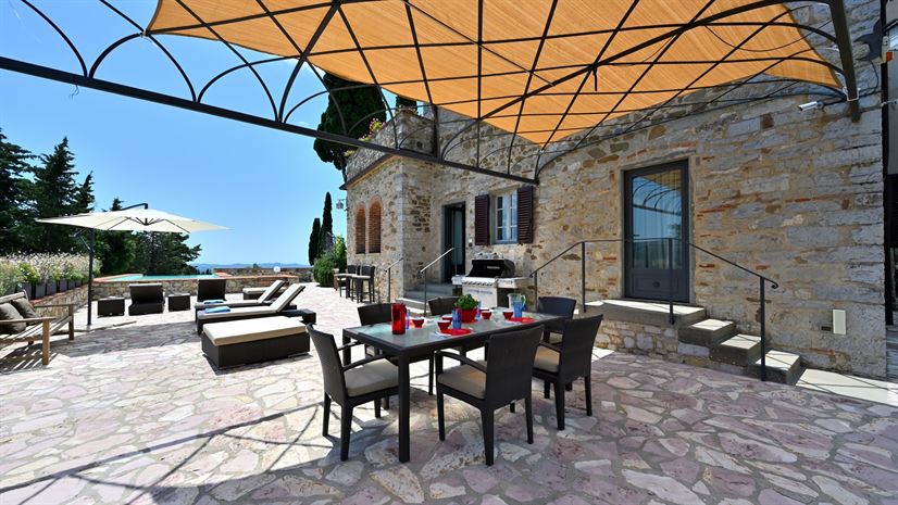 Okolica jest zaciszma, a osadę otaczają winnice i gaje oliwne. Apartament znajduje się na parterze i piętrze. Bezpośrednio za nim znajduje się przestronny, umeblowany taras z częścią jadalnianą, idealną na posiłki na świeżym powietrzu i relaks. Prywatny basen jest tuż obok i zachęca do odpoczynku.