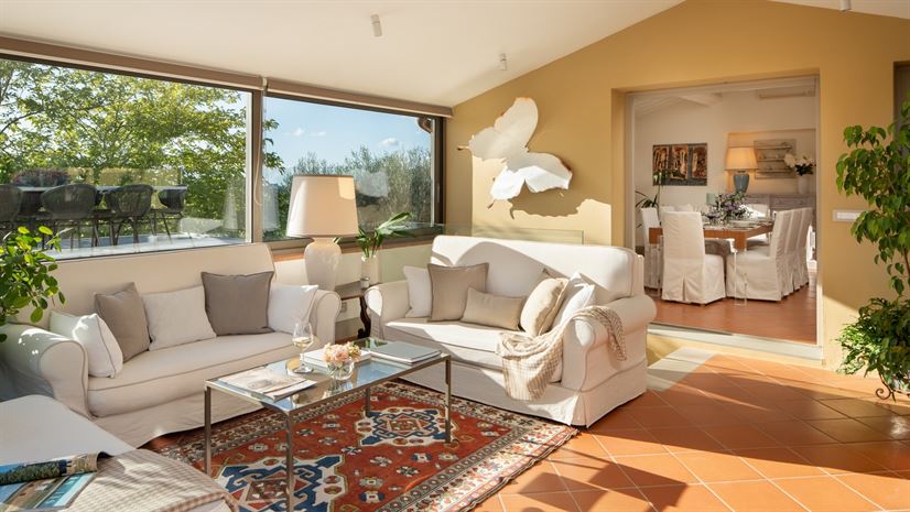 The villa overlooks olive groves dotted with contemporary sculptures. On the estate, there is also an open-air theatre where the owners host concerts and performances during the summer months, adding a unique cultural touch to your stay.