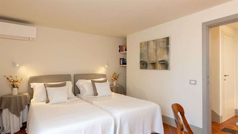 Twin beds (can be converted to a double), bedside tables, wardrobe, chair, desk, air-conditioning, French doors leading to the garden.