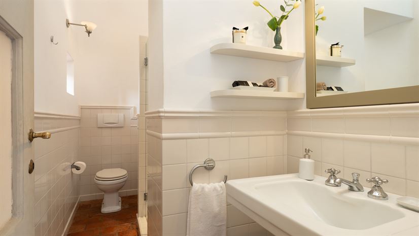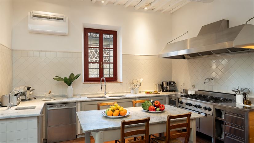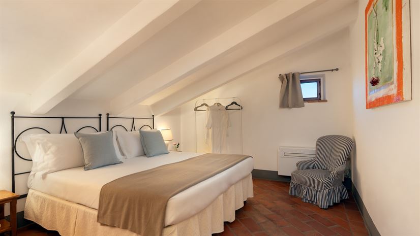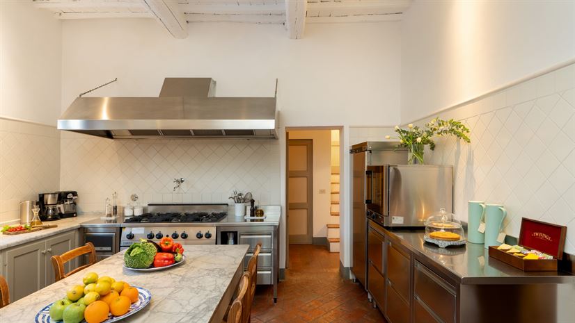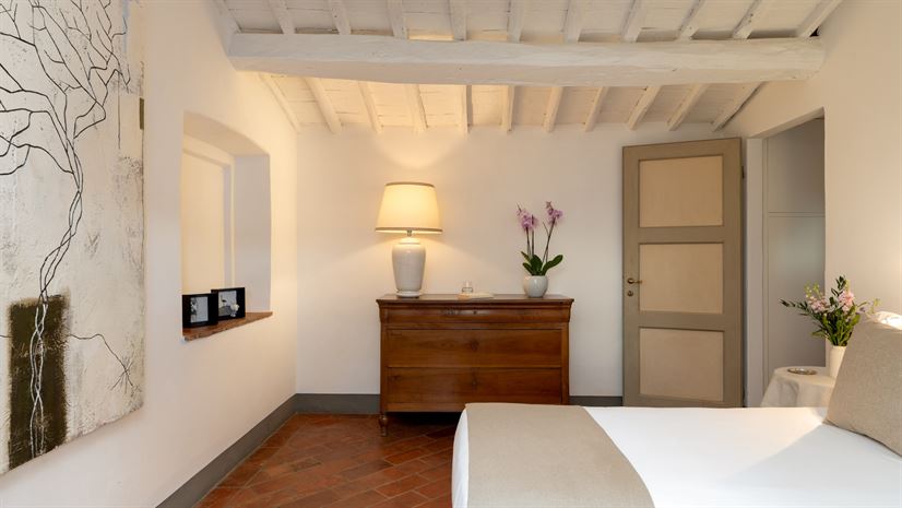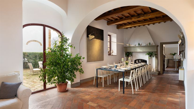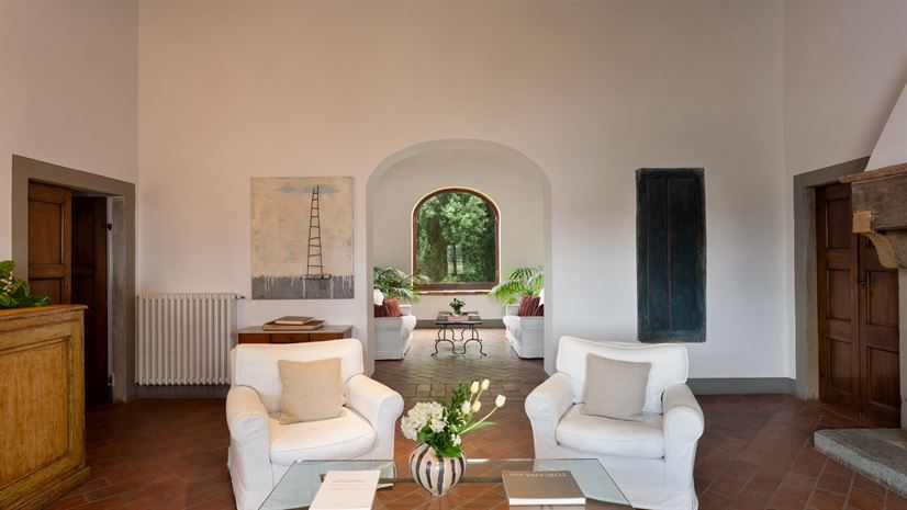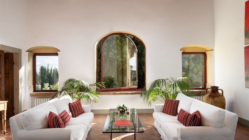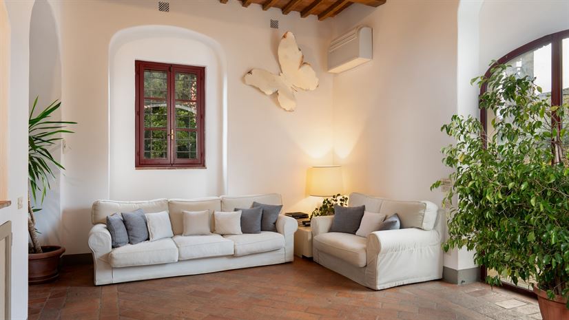 Wnętrze willi jest jasne i przestronne. Zachowano podłogi z terakoty, kominki i belkowane sufity. Nowoczesne dzieła sztuki oraz współczesne meble, uzupełnione o starannie dobrane antyki, tworzą elegancką i przytulną atmosferę.