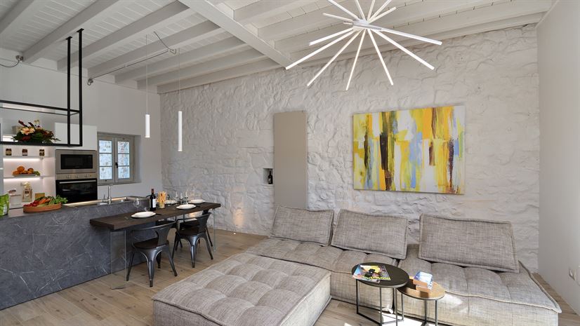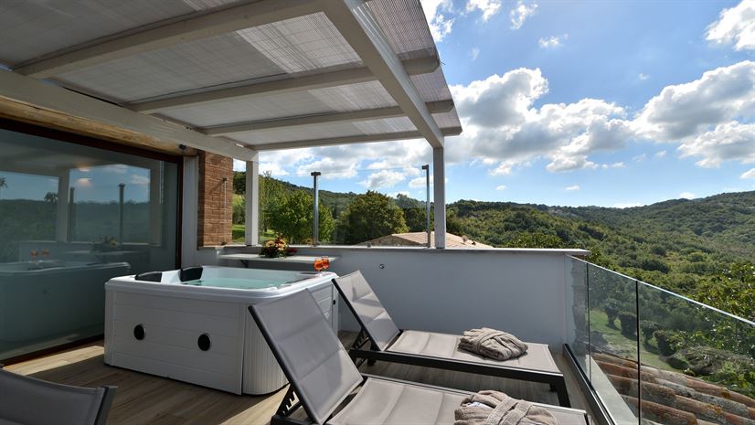 Ovile to piękny, przestronny apartament na parterze o jasnym, nowoczesnym wystroju. Stylowe wnętrze uzupełniają kolorowe, abstrakcyjne obrazy ścienne oraz harmonijnie dobrane tekstylia. Z salonu schody prowadzą na taras na pierwszym piętrze, wyposażony w stół z krzesłami, leżaki oraz jacuzzi. Taras oferuje zachwycający widok na region Maremma i stanowi idealne miejsce do relaksu oraz posiłków na świeżym powietrzu.