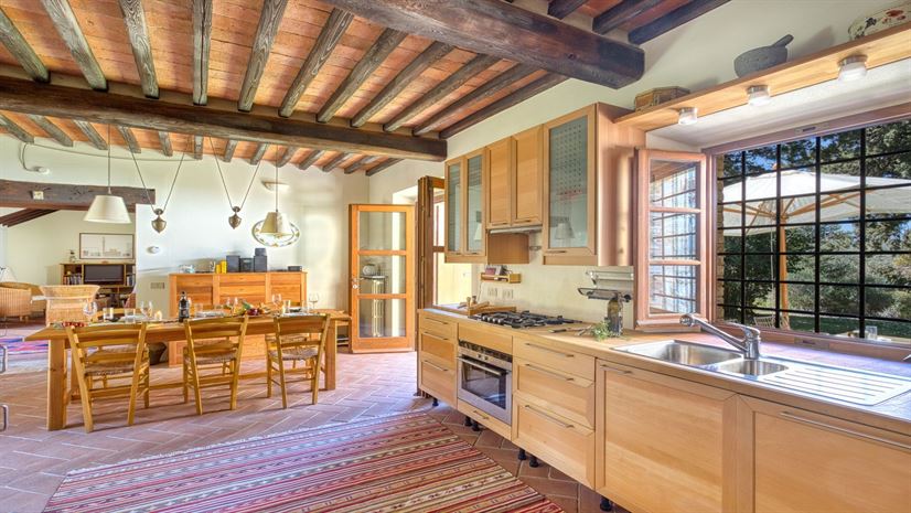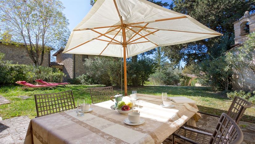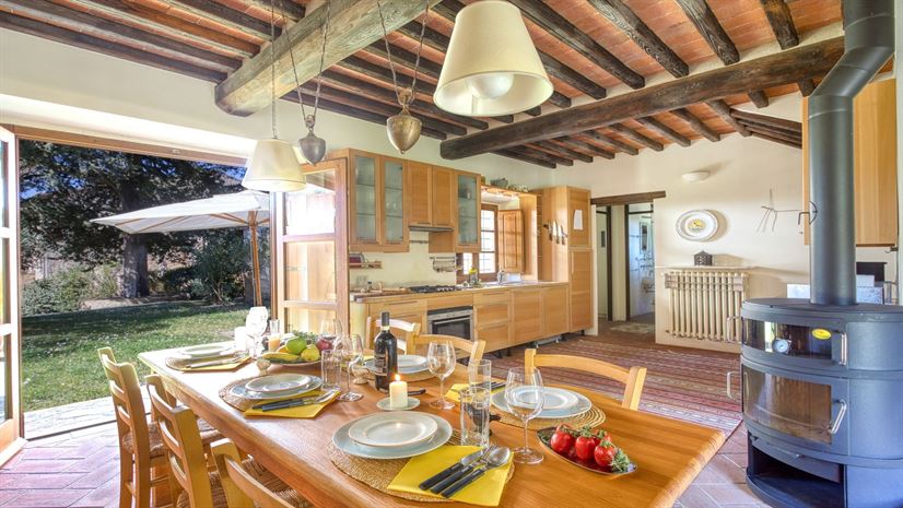 Masaccio at Galenda is a bright stone villa with comfortable furnishings, thoughtfully designed across two separate parts. One part features a spacious dining kitchen, while the other offers a comfortable lounge, creating a relaxed and practical layout. From both the dining and living room, you step out into a large private garden with sun loungers and a terrace with comfortable table and chairs, perfect for al fresco dining, with plenty of natural shade from the trees.