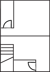 Chairs, table, wooden chest, side table, fireplace (decoration only), fan, door to external stone staircase.