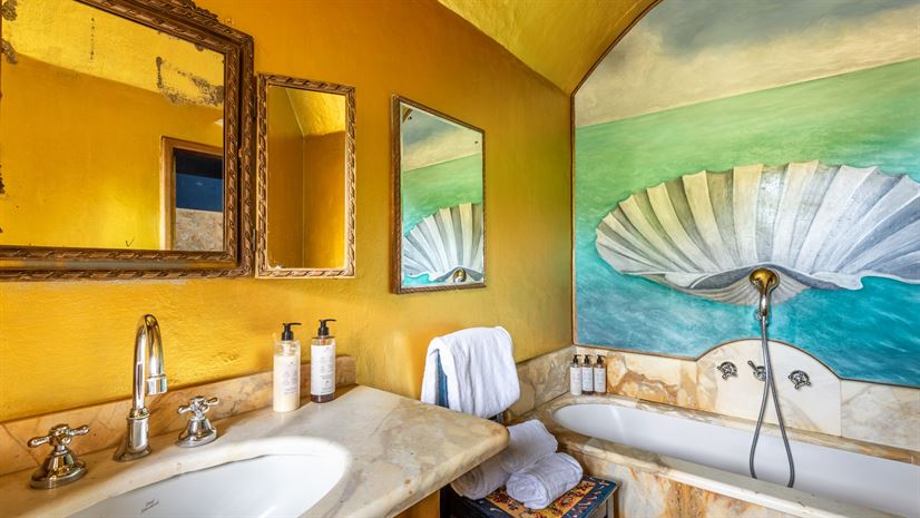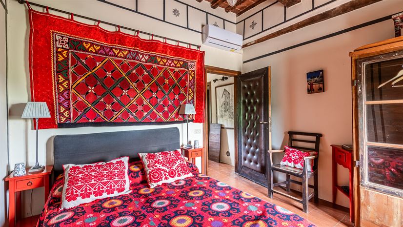 Wnętrza, pełne kolorów, z terakotowymi podłogami, sufitami z widocznymi belkami oraz stylowym wyposażeniem, tworzą ciepłą i przyjazną atmosferę.