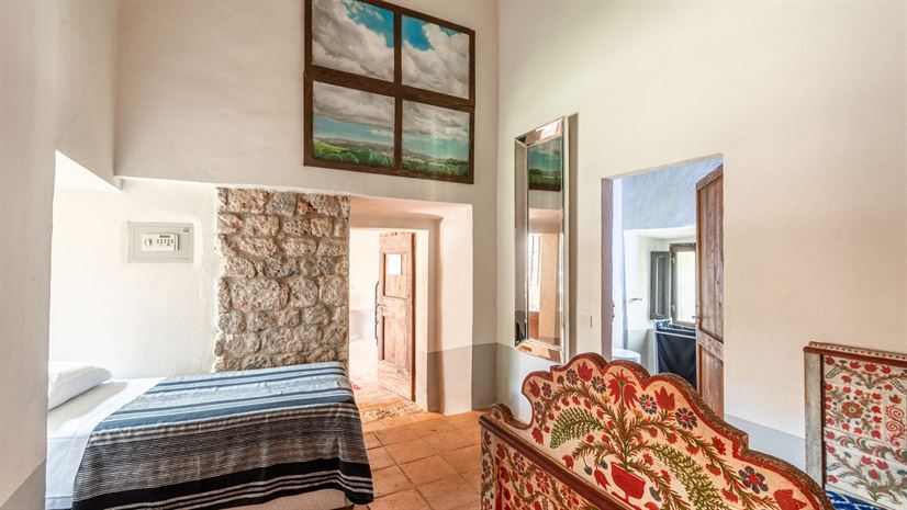 Łóżko podwójne 150 × 195 cm (nie można zamienić na dwa pojedyncze), kominek dekoracyjny, fotel, komoda, szafa, klimatyzacja, stojak na walizki, drzwi na zewnętrzne kamienne schody.