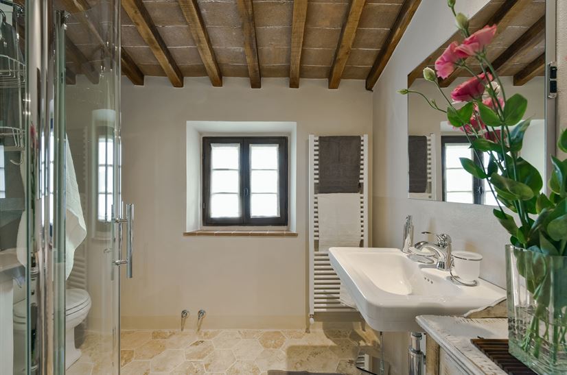 Wnętrza łączą tradycyjne toskańskie elementy jak drewniane stropy, podłogi z terakoty, kamienne ściany z eleganckimi meblami, marmurem i trawertynem, tworząc atmosferę pełną stylu i ciepła.