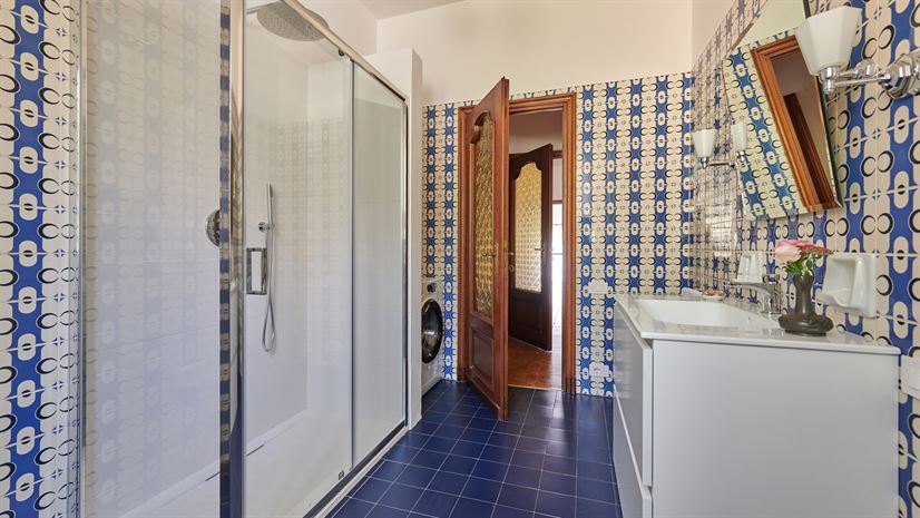 Prysznic, podwójna umywalka, bidet, WC, pralka.